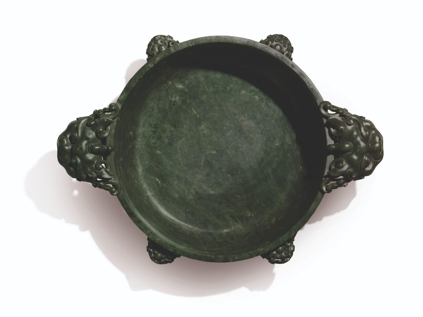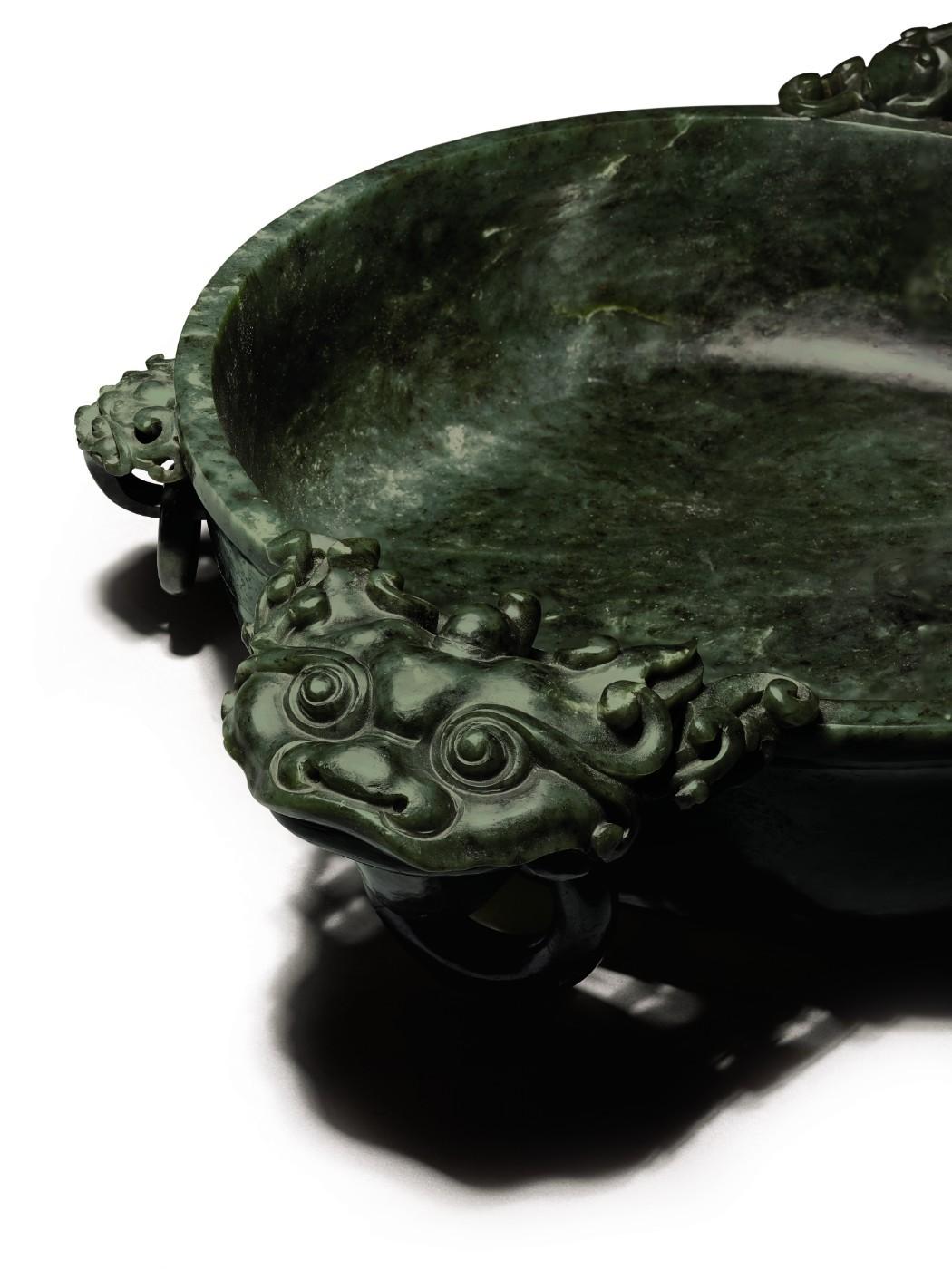 Carved with two large beast-head handles and four further smaller handles with freely-moving rings, the basin embodies the distinctive qualities of mid-Qing imperial jade. Measuring 50 cm in width at its widest point and 12.8 cm in height, the vessel is carved from Khotan jade, a material which was, and remains, both highly prized and beloved in Chinese culture. The jade has an extremely rich lustre, one of the distinct characteristics of spinach-green jade harvested from the Khotan region by the imperial court.
