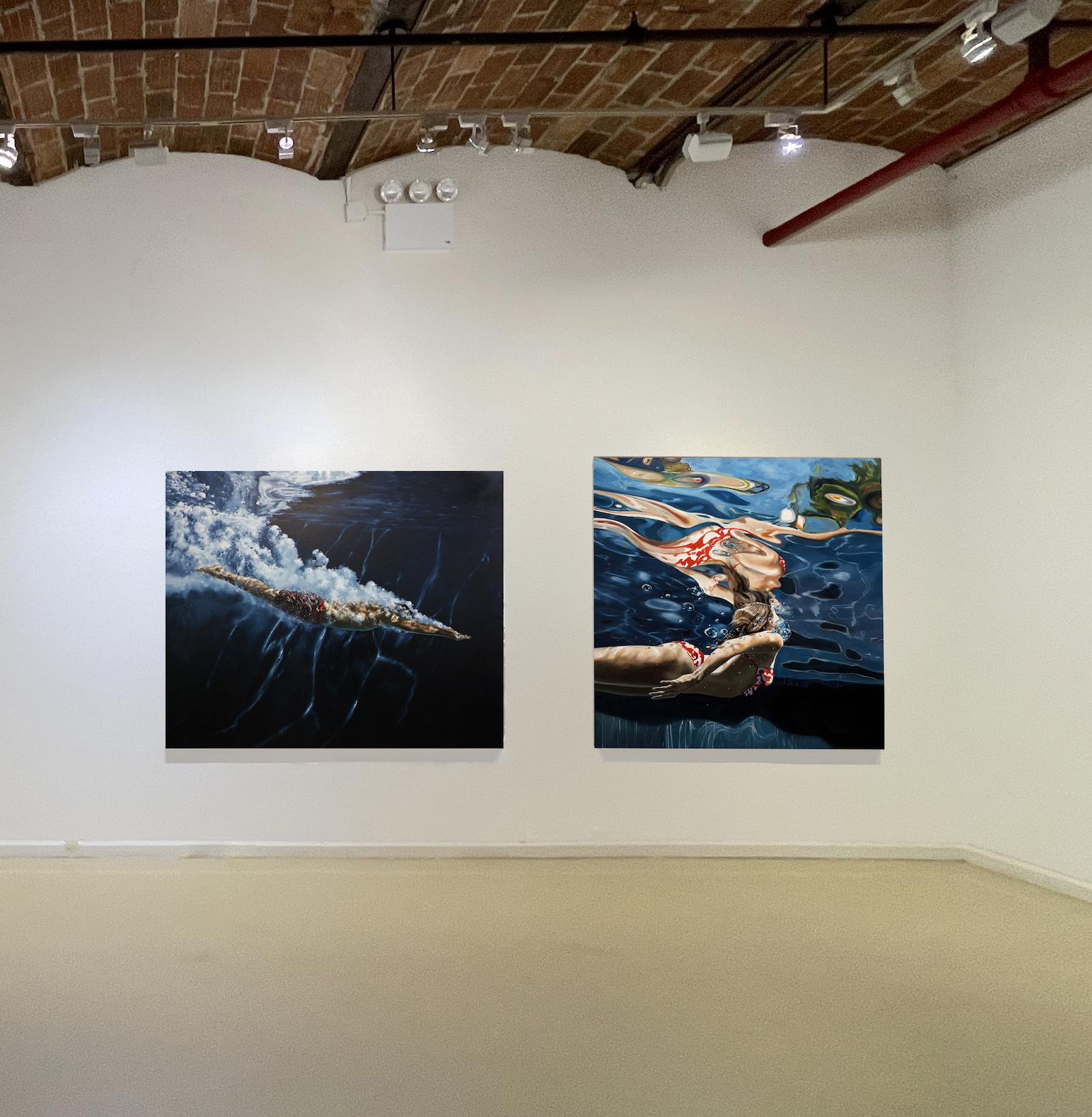 In Oceanscape and Shifting Tides we can see an evolution towards restlessness. Crests of foamy white form on the horizon. A prelude to a stormy sea. And finally, in Zener’s impressive diptych Surging II, the storm rages in full force. “This series of black and white oceanscapes explores the ocean as both subject and metaphor: a vast, restless body that mirrors the emotional landscapes within us all. From crashing waves and violent storms to still waters and serene horizons, these paintings reflect the full spectrum of human feeling, from chaos and despair to peace and clarity.”
