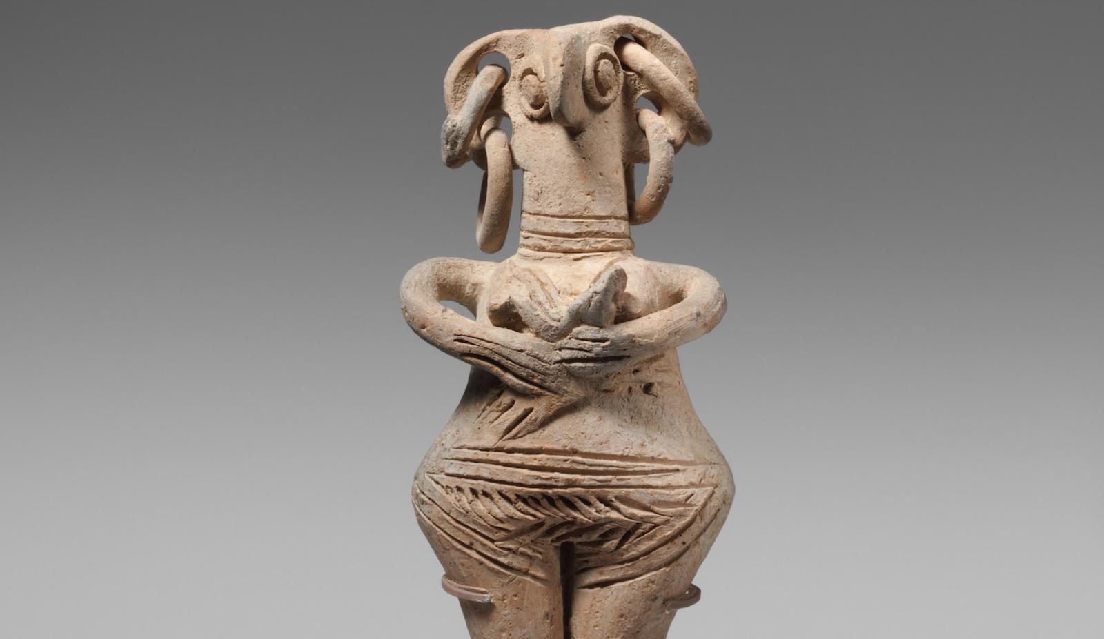 The Cypriots, based in modern-day Cyprus, produced a bevy of imaginative ceramic objects—from zoomorphic vessels to hollow figurines such as this one—especially in the Bronze Age. A reminder of fertility for this culture, these female figurines with emphasized genitals were particularly common and, in this period, were often placed in tombs.