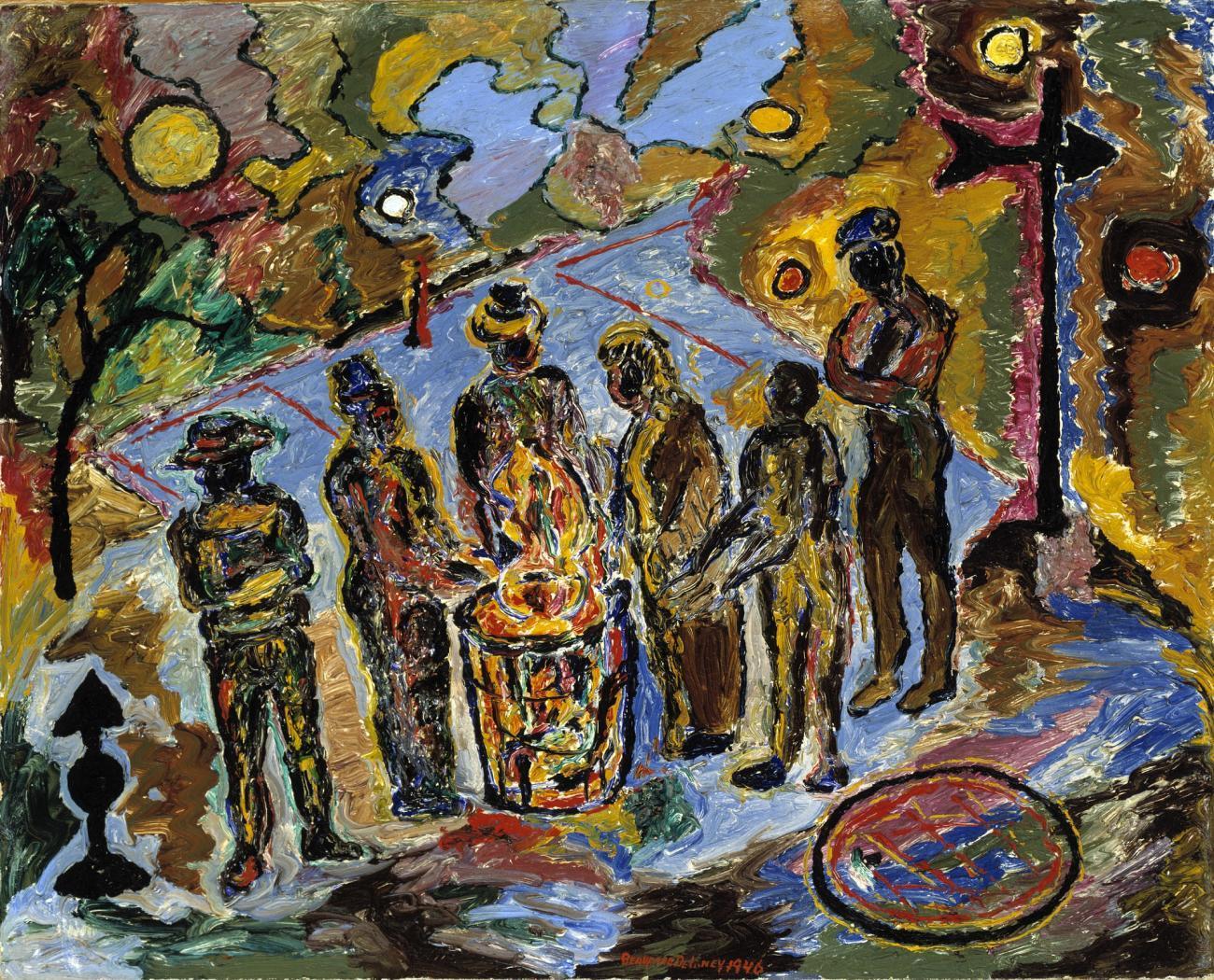 American modernist painter Beauford Delaney (1901–1979) was a prominent figure in the Harlem Renaissance, widely recognized for his pastel portraits of notable African Americans such as WEB DuBois and Duke Ellington. After moving to Paris in the 1950s, he became interested in abstract expressionism and was influenced by Van Gogh’s painterly techniques and Fauvism’s radical use of color. Can Fire in the Park is a moody, atmospheric street scene. Six men huddle stoically around a fire in a trash can, which sits midway between a basketball court and a manhole cover in the street, in a scene reminiscent of the Great Depression. The men are all dark silhouettes, orange firelight reflecting on their clothes, with added light from a full moon and a globe streetlight. The landscape is fluid and dreamlike, its unlikely colors echoing the colors and shapes of the flames.
