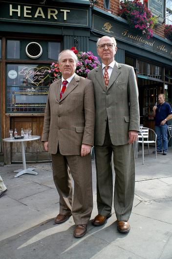 Gilbert & George posing in Hanbury Street, London, 2007.