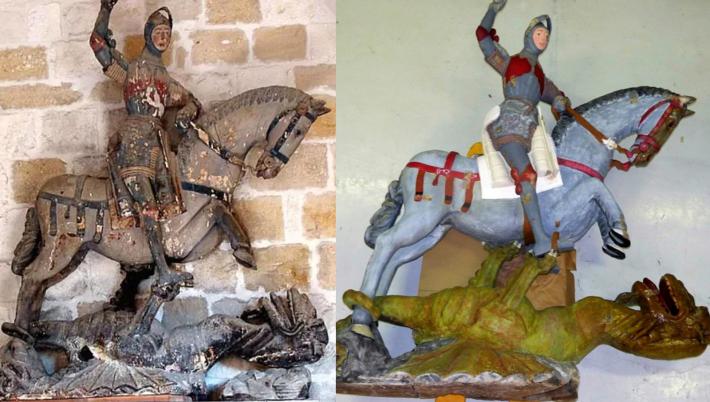 This 500-year-old sculpture from the Church of San Miguel de Estella in Navarre, Spain went viral after a failed restoration attempted by a local teacher. The resultant reimagining of Saint George was compared to a Playmobil figure and the cartoon star, Tintin. The church and the company responsible were fined upwards of $6,000. Additionally, the church eventually paid $37,000 to reverse the restoration.