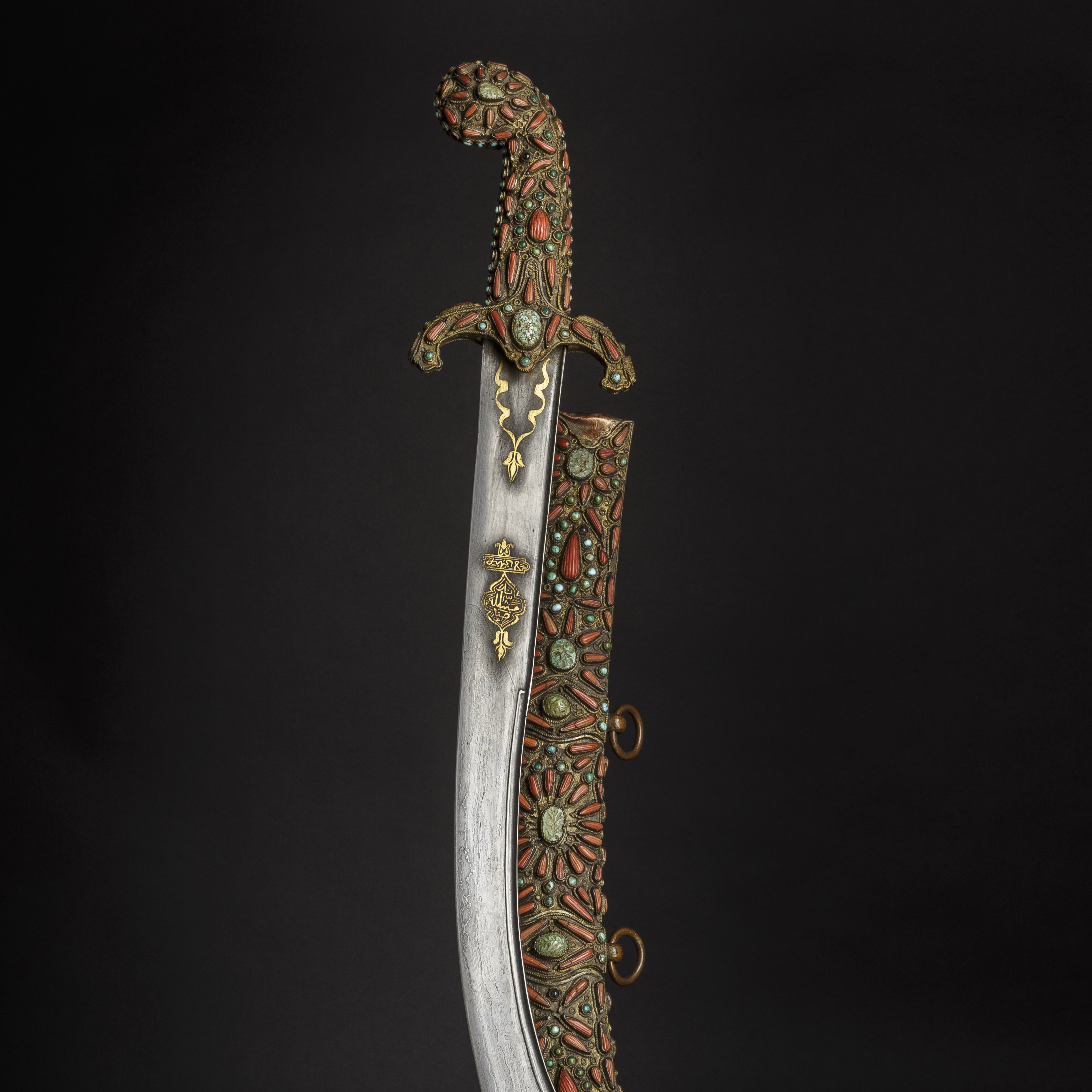 Photo Courtesy : Hermann Historica GmbHThis Damascus steel kilij is of typical shape, featuring a chiseled spine, pronounced yelman, and gold inlays on the obverse, reverse, and the chased back of the blade. It also includes filigree on the silver-plated grip, which is set with corals and turquoises. The scabbard is copper foil is embellished and features an inscription cartouche on the reverse, along with two removable suspension rings.