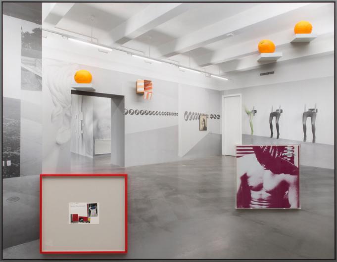 Image: Jonathan Monk, 15 Exhibit Model Detail with Additional Information XV, 2021. Inkjet print on aludibond in grey shadowbox frame, The Smiths record 1984 (Cover star Joe Dallesandro pulled from Andy Warhol's "Flesh", directed by Paul Morris- sey [1968]) in plexiglass box; signed John Baldessari post card in red frame; three oranges cast from real in PU resins and silicones on grey painted shelves, 132.5 x 170.5 x 4 cm.