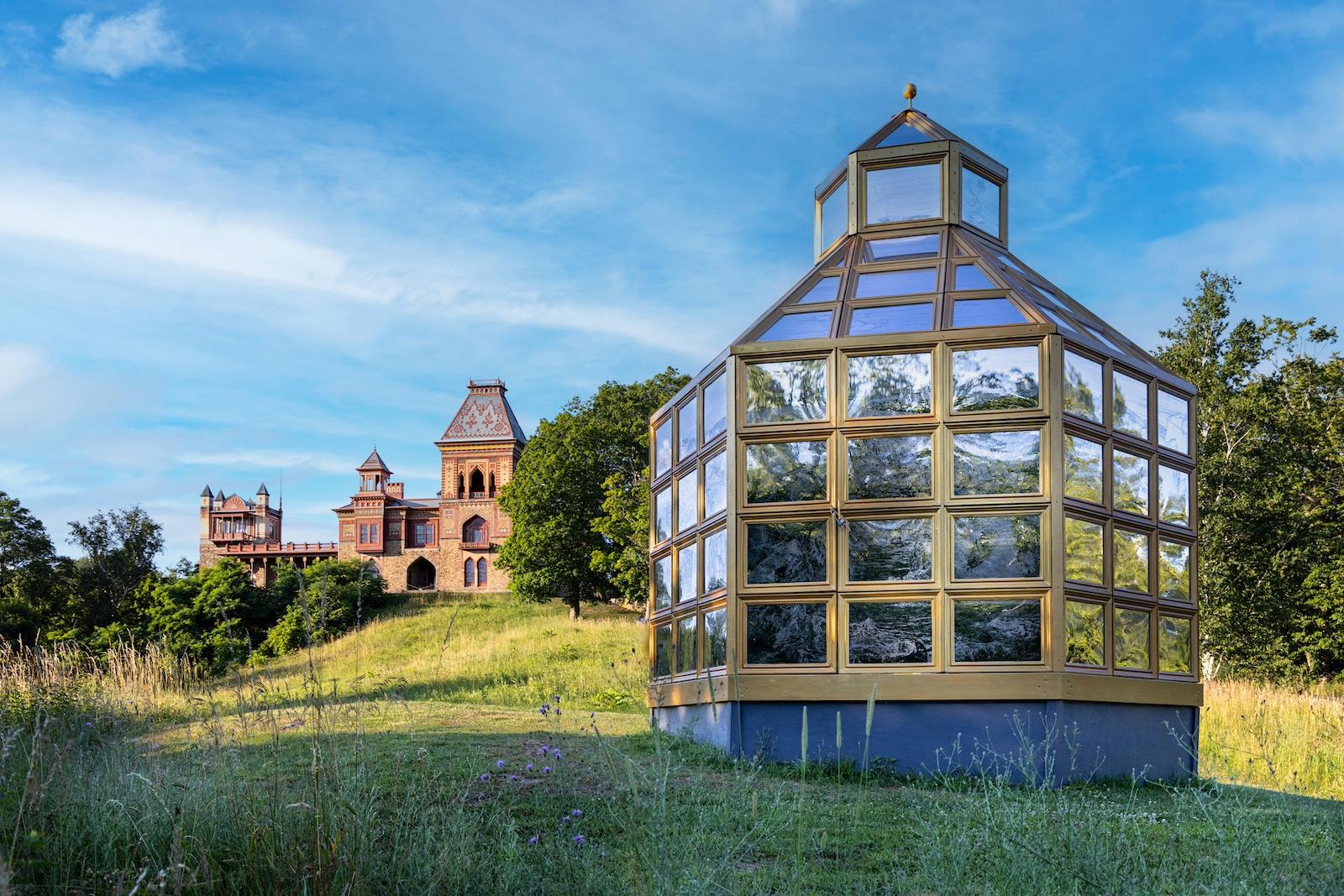 Installation view, Ellen Harvey, Winter in the Summer House, 2025. Part of "What's Missing? Artworks in the Olana Landscape," Olana's summer 2025 outdoor site-specific exhibition.