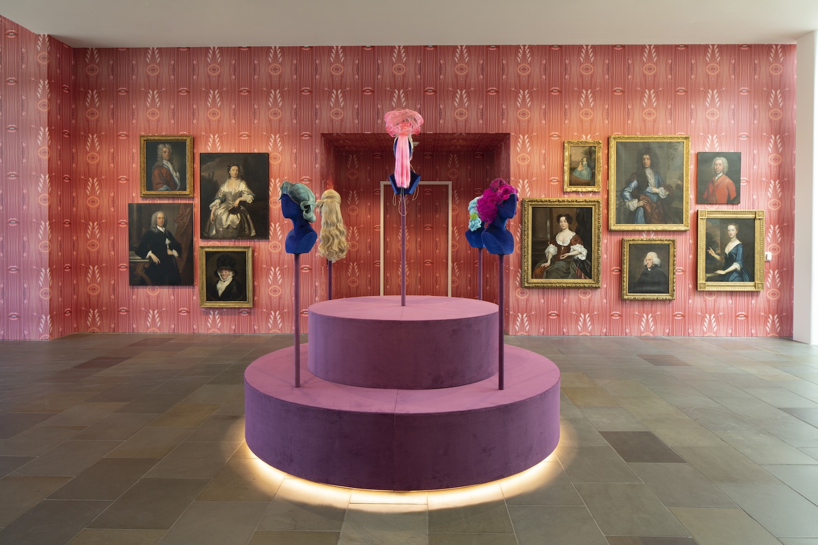 “In White Wig, Mehryl Levisse swathes the SCAD Museum of Art lobby in a monochromatic pink wallpaper. Mounted on this opulent pattern are paintings, selected by the artist, from the museum’s Earle W. Newton Collection of British and American Portraiture featuring prominent individuals of the 18th century. Placing these portraits within a taxonomy of symbols of performative gender, Levisse examines the use of hairstyle and dress as markers of status and identity that have been historically separated into the strict binary of man and woman.”